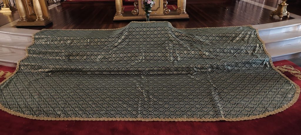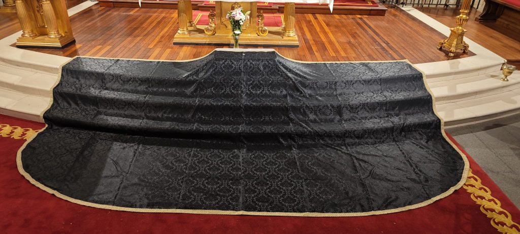 Uno de los mantos se ha elaborado en Damasco negro, sobrio, en señal de luto, rematado con filigrana en oro.